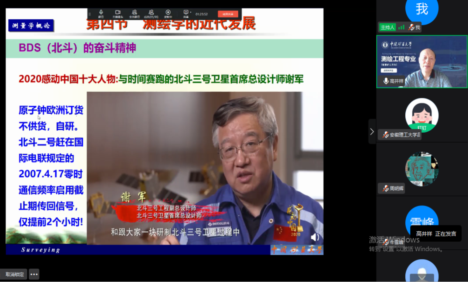 高井祥教授的授课内容新颖,感人至深。中国大地原点建设、青岛观象山水准原点建筑,CETV中国教育电视台与高井祥教授关于珠峰探测的精彩访谈,古雅精美的测绘地图,测绘相关工作的历史和现代名人(华盛顿,温家宝等),感人的测绘人故事(与时间赛跑的北斗三号卫星首席总设计师谢军),宽广的测绘融合(数字地球、物联网、云计算、智慧地球),一体化的通导遥集成,给每位聆听者都留下了深刻的专业印象,广大新生也被我国测绘发展的历史悠久、现代强大、未来领先的状况与测绘从业者的测绘精神所激励和鼓舞。